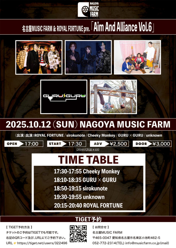 タイトル | 名古屋MUSIC FARM & ROYAL FORTUNE pre. 「Aim And Alliance Vol.6」 |
