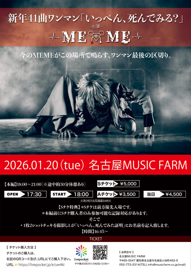 | 備考 | 【Sチケ特典】 Sチケは前方優先入場です。 本編前にSチケ購入者のみ参加可能な記録対応があります。 そこで • 1枚2ショットチェキを撮影しLが「いっぺん、死んでみた証明」とお名前を記入致します。 【時間】 16:45〜 |